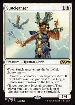 Suncleanser -- YES! I love this card. Removing experience counters from an opponent, removing divinity counters, wiping a creature loaded with +1/+1 counters like Chasm Skulker or preventing one of your creatures from being murdered by Hapatra, Vizier of Poisons slowly, this card has a ton of utility. It could see play outside of dedicated hatebears strategies. I also feel like Mark Rosewater was directly responsible for this card lacking the ability to remove poison counters from you, which is too bad. I feel like he saw that scene in Stand By Me where Jerry O'Connell found the leech in his underwear and was grossed out and now none of us get Leeches effects ever again. That would give this creature an additional use but I think it's fine as-is.