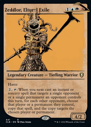 Exciting stuff, but there's a final bit of rules-drudgery to cover before we press on. Zevlor, Elturel Exile received some immediate errata - an official rules-change by WotC - shortly after spoiling. It now reads: "The next time you cast an instant or sorcery spell that targets only a single opponent or a single permanent an opponent controls...". This change prevents Zevlor from copying cards that can target a single opponent while also targeting you (Ex. - Prismari Command). However, cards that benefit you without self-targeting (Ex. - Sakashima's Will) are totally open for Zevlor to Xerox. Also, a card need not specify "opponent" in order for Zevlor to work, as any card that says "target player" counts so long as the player getting targeted is a single opponent (Ex. - Portent).