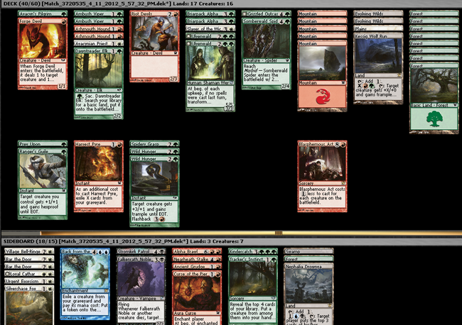 The only choice I had was which 5-drop to leave in the sideboard. I chose to not play the Nearheath Stalker. Grizzled Outcasts was better because it worked well with my Wild Hungers and Kessig Wolf Run and because it had the potential to be a 7/7 that would have to be chump-blocked. The Somberwald Spider was better because in my deck, I would be trading a lot of creatures in combat, and therefore, I would have morbid very easily.