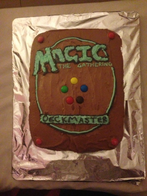This cake is not a lie. This cake is awesome. When your friends make you a cake based on the game you all play together, everything is right in this world. I love seeing Magic: The Gathering cakes out there because they’re not an easy task. Have you seen the back of a Magic card? There are some crazy marks there. I mean, someone left a freaking pen mark on the cards! Being able to make a delicious version of a Magic card is no easy task, and I applaud all those who can do so. Super, now I want cake.