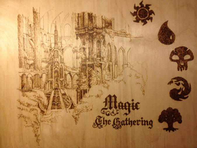 Pyrography. It’s pretty sweet, right? I can’t begin to imagine the time and effort it takes to create something this fantastic. I love that they didn’t use the regular Magic font for the words. I also love the use of Temple Garden as the backdrop. It creates a really unique high-fantasy feel. This is perfect for custom collectors everywhere—although, I think there’s only one in existence. Good luck, collectors.