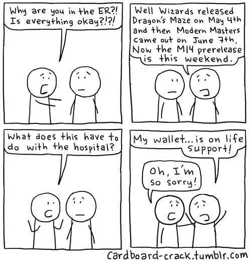 Asking around, it looks like #MTGM14 Pre-release numbers will be down this week because players are tapped out from #MTGMM play & costs