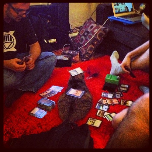 I’ve talked about how cats love attention and Magic: The Gathering. It seems that this kitty was bothered that no one was paying attention to it. So, it decided to do something about it. I don’t have a problem with people using the kitty as a table; I am just worried about when the cat decides it’s had enough and gets up to move. Then, the whole table state is ruined! Take my advice: Sedate the kitty to ensure it doesn’t move.