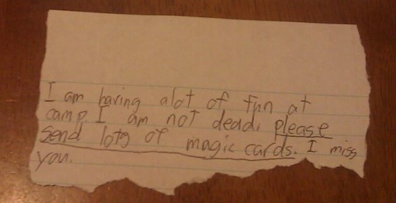 I was never able to experience a summer camp. But I’ve lived through the ’80s, so everything I needed to learn I learned from television and movies. This young camper has sent quite the note home to Mom and Dad. There is so much about this note that I love. Mainly the line, “I’m not dead.” I mean, if you’re going to write a letter home, you might as well put everyone at ease by letting them know your mortal status. I just hope the kid isn’t disappointed when he receives nothing but David Blaine tricks in his care packages.