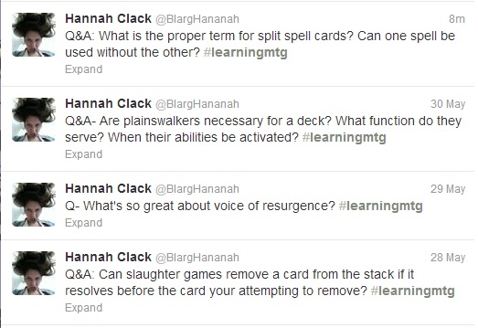 Hannah Clack just recently started learning Magic: The Gathering and is using the power of Twitter to grow her knowledge base. Using Twitter is an innovative way to learn Magic and document progress as she enters further into the game and the community. Doing daily Q&As with the hash tag #learningmtg, Hannah is quickly learning all she can via Twitter and at her local Friday Night Magic scene. We have all been there when learning Magic: The Gathering. With twenty years of rules, mechanics, and an ever-growing competitive community, this is a very challenging game to get into. I wish Hannah the best of luck on her Magic: The Gathering quest.