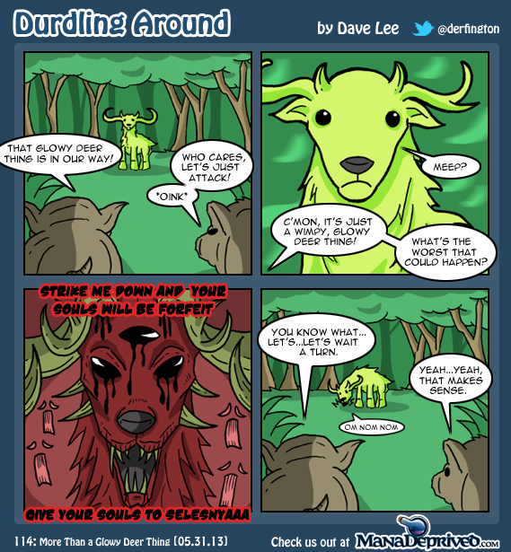 It’s just a green, glowy deer. What’s the worst that can happen? Durdling Around shows us exactly what could happen. I laughed really loudly when I read this comic because I have seen situations where Voice of Resurgence hits the battlefield and the opponent is left with two options: concede gracefully or swear loudly and scoop. There are plenty of ways around Voice, but there is always that moment of, “I’m pretty sure I can deal with this” Just before its cold, dead eyes stare deep into your soul, you decide to “just wait it out.”