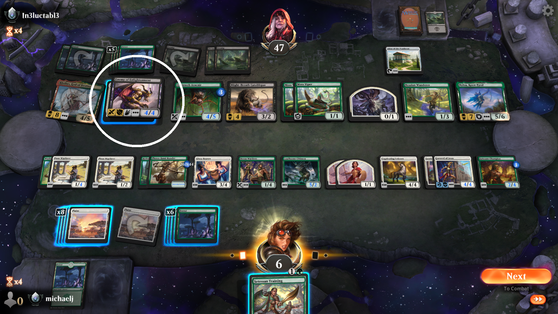 The obvious implication is that I drew Setessan Champion late: Notably, after the opponent already had Enemy of Enlightenment on the battlefield.