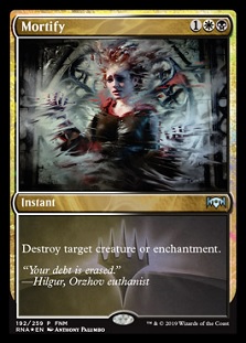 Mortify will also limit the potential success of Simic Ascendancy and cards like it; plus give texture to games currently hinging on Conclave Tribunal and its cousins. I mean enchantments are all well and good as long as no one can remove them... But what happens when lots of people can?