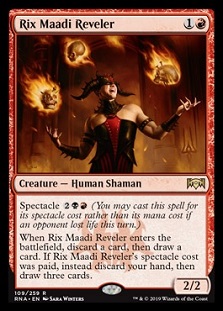 The Spectacle is kind of expensive, but can make this Human Shaman an exciting topdeck in the midgame. If you can rip it in topdeck mode (or any time after you have fewer than three cards in hand, really) Rix Maadi Reveler will threaten to bury your opponent.