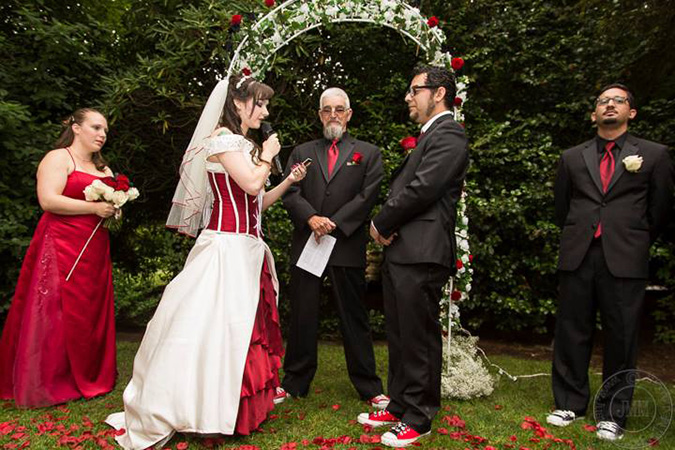 What’s the most exciting part of being a Magic player? Busting open a booster! We decided to have our wedding vows inside of booster packs. Since we started dating during Dark Ascension—and it remains Tifa’s favorite set to this day—we used wrappers from that set. The vows were on blank Magic cards, and actually, both included references to the game. Tifa claimed there was “no soul in the multiverse I’d rather have by my side.” Mike said, “Today, you and I join forces to create a marriage of Mythic rarity.” Tifa called Mike her winning card and her first pick. Mike promised to always draft Magic with Tifa as long as we can. We both made references to forever being Two-Headed Giant partners. Our ceremony also mentioned the multiverse.