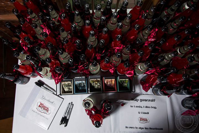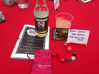 We also wanted our favors to be awesome for people who played Magic, but still cool for our relatives and friends who aren’t Planeswalkers. Everybody received a Jones soda with a dice bag wrapped around the bottle that included dice. We stamped roughly a thousand full-art Zendikar lands with our wedding logo (designed by Inkwell Looter) so that everyone could take one home and the Magic players could use them in the Drafts. Oh yeah, that’s right—we had Drafts at our reception. In addition to a dance floor, an amazing flipbook photo booth, a six-foot-tall Jenga tower, and many board games to pick up and play, we had our judge friend Allison Medwin be our official wedding tournament organizer and organize Drafts throughout the night. In fact, people were playing Magic so far into the night that the bride’s parents had to kick them out when our venue time expired.
