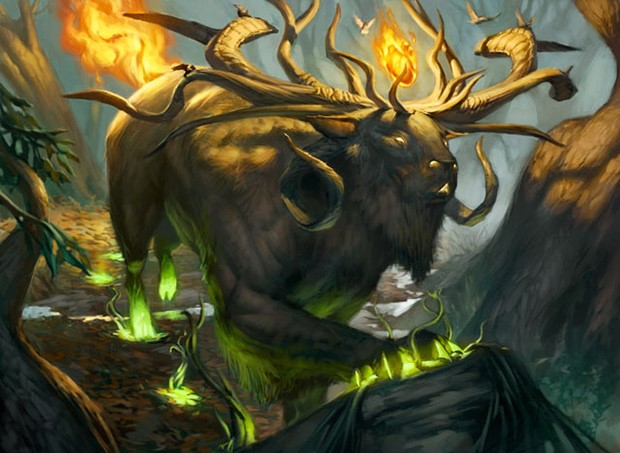 I’m used to Jesper’s normal color palette of warmer colors (reds, oranges, etc.) with some great musculature and a tail whipping in the frame. This image seems like a black card that was made green. Ghosty-type stuff happens in green, but it’s pretty uncommon. With the giant horns, I forgot what the Alara creatures looked like. Jesper did Beacon Behemoth and Rakeclaw Gargantuan for the Shards of Alara block, and not a single creature from Meglonoth to Godsire to Paleoloth to Wooly Thoctar fit the aesthetic of this Naya Beast. It feels . . . out of place on purpose. Alara had its five shards torn apart and then put back together, and all hell broke loose. Perhaps this is what has survived. I like the idea of a green creature, calling upon ancestors for aid. It feels like an area where green mechanically interacts with the graveyard compared to black. Whereas black is selfish, forcing humans into zombie servitude, green asks for assistance from the past and—in some cases, as with this card—the future. I like that idea.