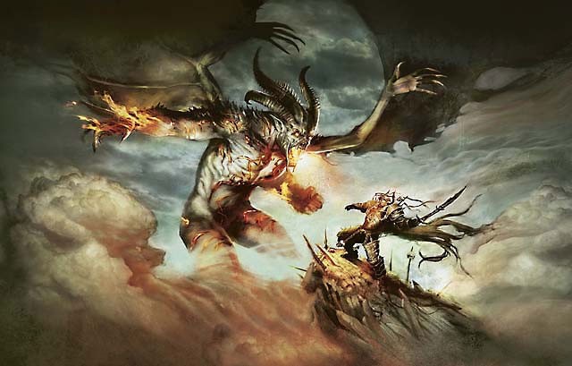 I would riff on the fat pack epic scenes that have been around for years—such as, for example, the image of Korlash, Heir to Blackblade" href="/p/Magic%3A+The+Gathering/%3Ca+href+%3D+%22javascript%3Avoid%28%29%22+target%3D%22_blank%22%3EKorlash%2C+Heir+to+Blackblade%3C%2Fa%3E">Korlash, Heir to Blackblade versus Tombstalker by Jean-Sebastien Rossback—and then recreate them anywhere I could. Often, these are Spectrum annual art volume inclusions and quite amazing in the imaginative realism sect of fine art.