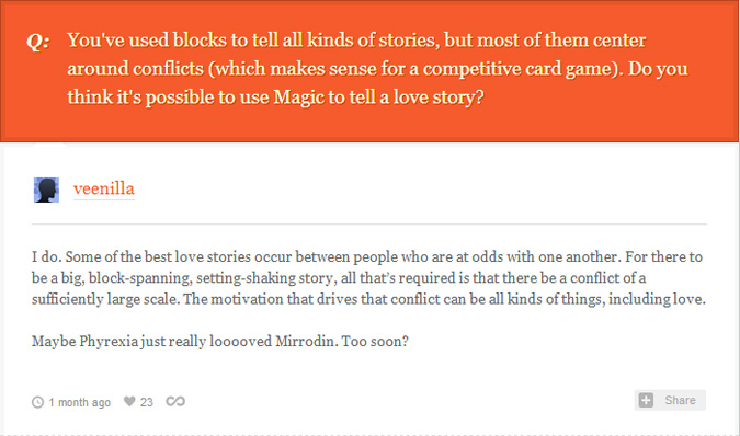 Clearly, Magic design can be done on a full-block scale. The Iliad turned out okay. Only Jace and Liliana had a relationship for planeswalkers in recent times, and even that was brief and rarely mentioned. In the past, of course, planeswalkers procreated and had children. Read Arena; Garth had children, though we aren’t sure if his spark was active then.