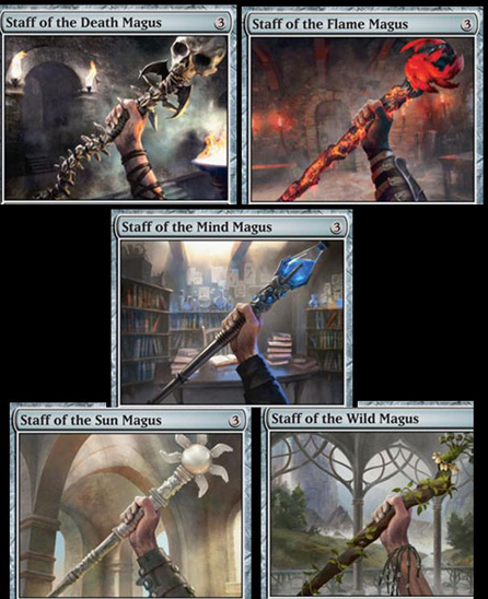 Staff of the Death Magus, Staff of the Flame Magus, Staff of the Mind Magus, Staff of the Sun Magus, and Staff of the Wild Magus by Daniel Ljunggren