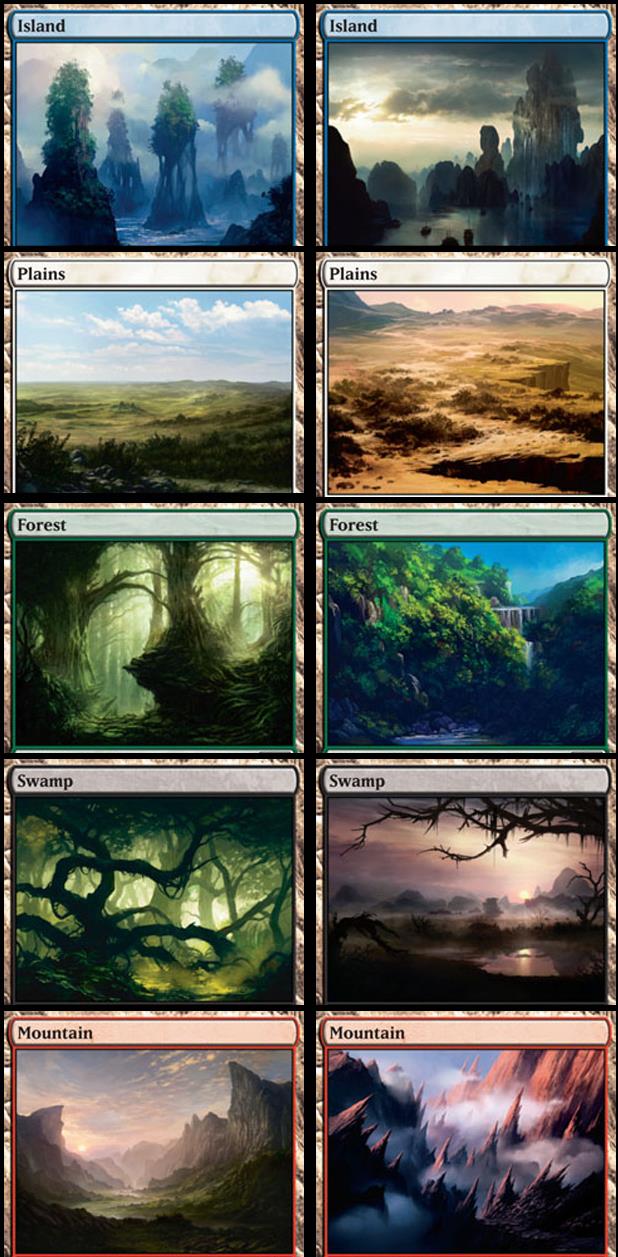 There are two new Plains, two new Islands, two new Forests, two new Mountains, and two new Swamps. Two of each are by Andreas Rocha, and the others are by Jonas De Ro, and they’re great!