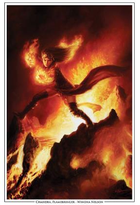 The lighting is so perfect, so correct, that it actually detracts from the image. Go into a forge, and you’ll see similar colors. The problem is that by doing so, it eliminates detail and seems less perfect because imperfections can be hidden. This is a major branded image. We need to fully see the person. Is there a reason this image wasn’t used in promotions considering it is Chandra’s set? I have no clue, but it’s a non-zero answer.