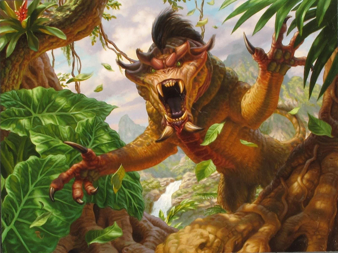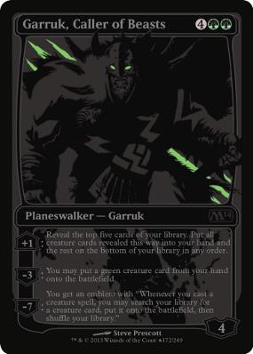 The full scene is a hundred times better than the cropped version, and I’m happy for that. I like seeing a scene, showing the planeswalker in action. It’s odd to see an eight-foot-tall planeswalker next to truly giant beasts. It’s among the hardest things about Garruk to show: his sheer size.