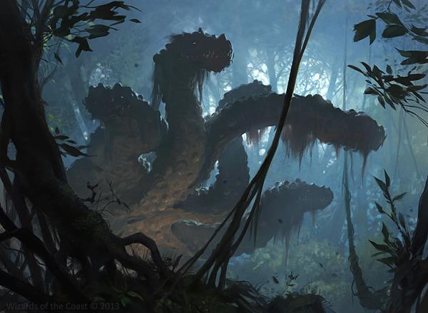 This image has an epic quality by the taut muscles and leaning-back “hero” we’re gazing upon. I like some humanoid races to have a variety of visual styles. Not all ogres need to be ugly, and all elves shouldn’t be beautiful. I’m happy to see that core sets showing a little more variety, possibly even foreshadowing into future sets on a visual style. Keep a look out when you see “oddities” like slightly deviated creatures. Usually, those are plants for the next block since our core sets turn over yearly.