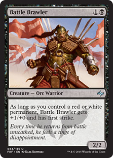 Another new Warrior that caught my eye was Battle Brawler. Although it’s just a vanilla 2/2 by itself, it becomes a 3/2 with first strike when you have a white permanent on the battlefield, making it a great deal for 2 mana. Although this deck is mostly black, it has enough white permanents that the Brawler should be beefed up most of the time.