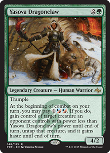 Yasova Dragonclaw isn’t quite as good without the bolster mechanic or some other way to increase her power, particularly since many of the best things to steal have 4 power. However, the ability can still do some work. Stealing a Courser of Kruphix can let you play a land off the top of your library, gain 1 life, and then hit your opponent for 2. Any creature you steal with Yasova should be able to get in some damage—no one likes killing their own creatures.