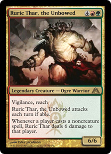 Ruric Thar, the Unbowed really punishes control players but is effective against almost any strategy. Spell-based decks won't be able to dig for answers with cards like Think Twice, and any answer your opponent does find will cost him 6 life to use. Against aggro decks, a 6/6 is big enough to kill most of your opponent's creatures, and vigilance makes it so when you attack each turn, you do so with impunity, still having your giant guy back to block.
