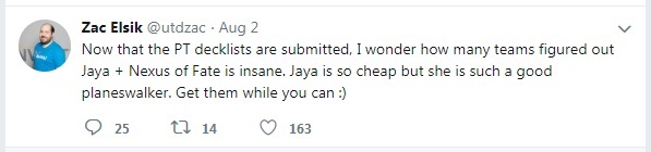 While I'm excited to give the Turbo Fog version of the deck a try, I recently came across another deck featuring Nexus of Fate that I find very intriguing. In his article from July 26th, Sullivan Library: On Dumbos and Dinosaurs, Adrian Sullivan mentioned that he had also been trying out Nexus of Fate decks and had been talking to Zac Elsik about an exciting, new archetype. That peaked my curiosity and I began my search for more info on this new deck. What I found was a tweet from Zac on August 2nd.