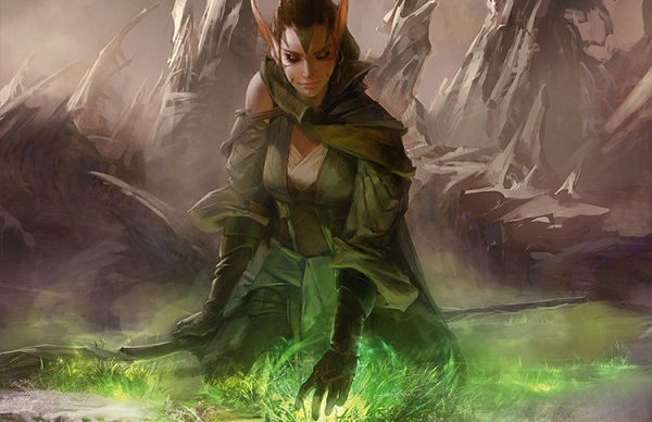 I love limited palettes of colors. With white, green and yellow as the only colors a Green deck fits perfectly with the visual look along with the emotive connotations it brings of plant growth. Life is even emoted through the bent branches, showing us growth and life to align to the mechanic perfectly. The flowy hair adds to the organic nature that the original doesn’t quite have as all aspects aligning to one mechanic - growth of mana and in this case, forests, or plants.