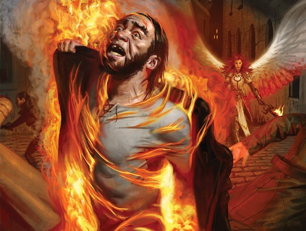 Here’s another example of a good execution but forced into an art description and sketch that is only good, instead of great. The whole story of Innistrad was the corruption of Avacyn’s whole flight of angels. We see hundreds of depictions of torment and a spell’s impact on someone not noteworthy. What made Innistrad’s story progress was to see the madness in the angels and then, why they were driven made by the Eldrazi. Here, we have no hints, no warning that an unseen terror is causing this. It’s just a man on fire, presumably by the angry angel in the background.