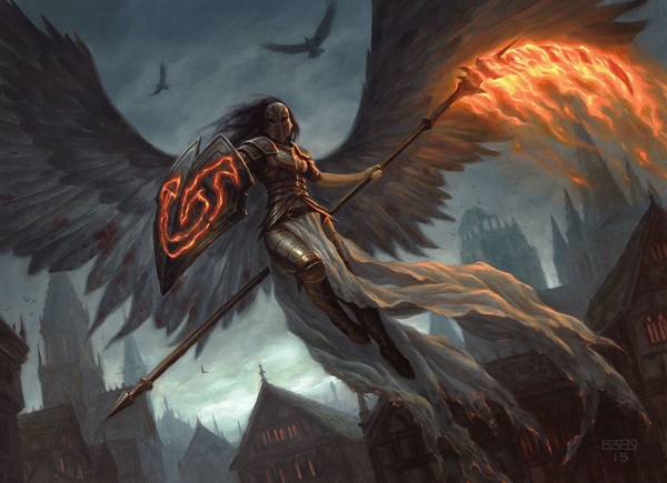 The fire as figure with the spellcaster totally in shadow is strongly executed. It isn’t quite fire, as it’s a White spell, so showing “smite” or brilliant, focused sunlight doesn’t have a ton of reference. I like Ryan’s take on the previous iteration, allowing the spell’s effect to be the focus, despite having a figure in the dead center of the piece.