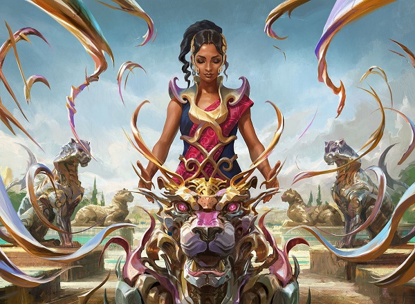The movement and forms in this artworks are the precedent and one of the first images we saw of the entire Kaladesh plane. We were able to see artifice, organic metal, a symmetrical scene and harmony. It’s as if Esper was given rules, math to bend the wildness of etherium. It’s a more beautiful Esper and who better to introduce than the new planeswalker Saheeli Rai.