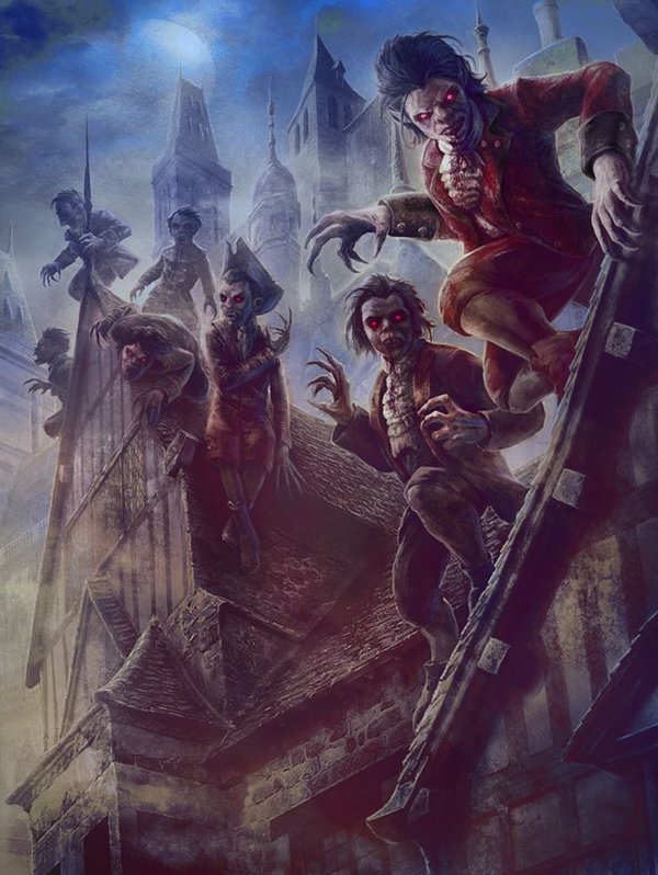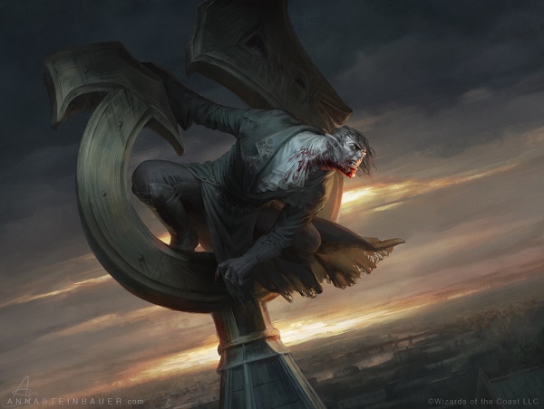 Anna received a ton of promotional card art commissions in 2016. This vampire changes the berserker hanging from a cryptolith to another symbol of the new Innistrad, a distorted Avacyn symbol, a corrupted one. It shows the eldrazification affected both flesh and also belief.