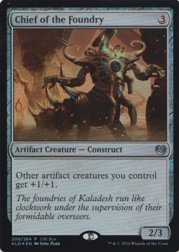 I don’t have much to say about Jung Park’s rendition of Chief of the Foundry simply due to being unable to find even a jpg online. I do see Aetherworks Marvel in the background, otherwise the construct itself is near identical to the original artifact creature.