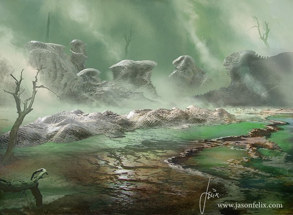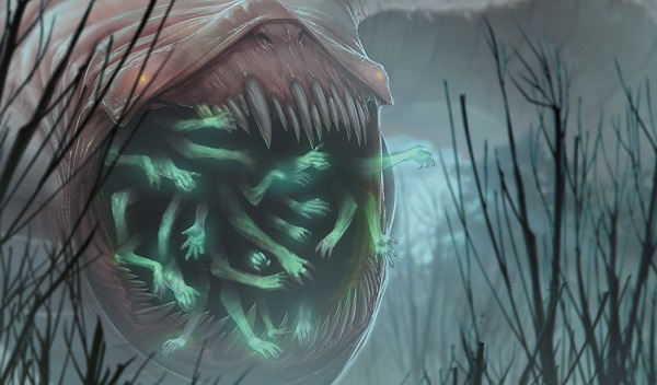 I had some help finding this image and I’m happy I did. What could’ve be seen is now clear. Izzy remvoed the chains on the hands of the souls in the original and instead quieted the scene in the marsh. He showed nostrils, which are horrifying, like lips to a wurm. It adds to the concept creature creation and ups the creepy factor.