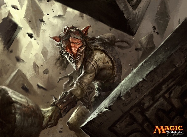 Removing the goblin and swapping it with any other character still makes a cool depiction. Darek made a tight scene, framed by known barriers of hedrons, with an arm projecting toward us, the viewer, engaging us in his destruction. My thoughts on digital blur effects are known. What isn’t known is that I love the goblin’s face. It’s a face, yet distorted like an episode of Face Off, forcing us to look and examine it closer. That’s a good thing.