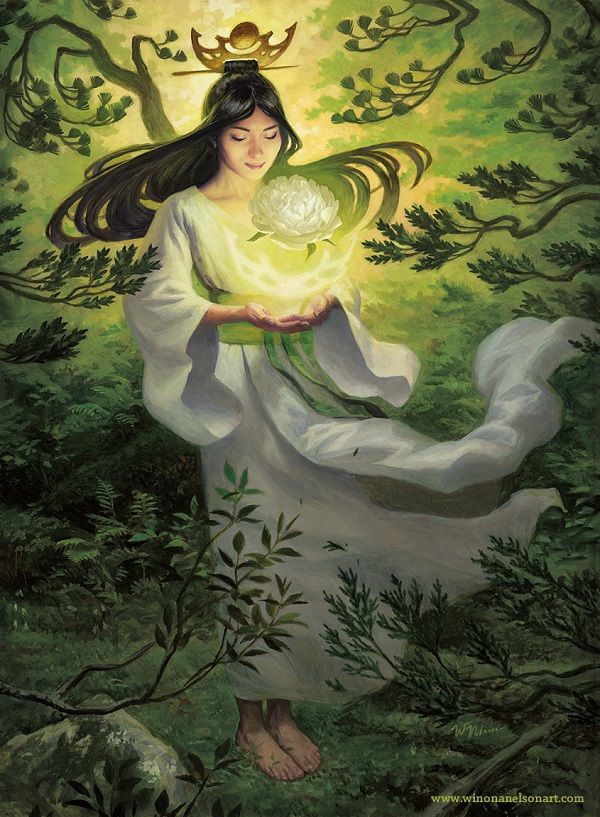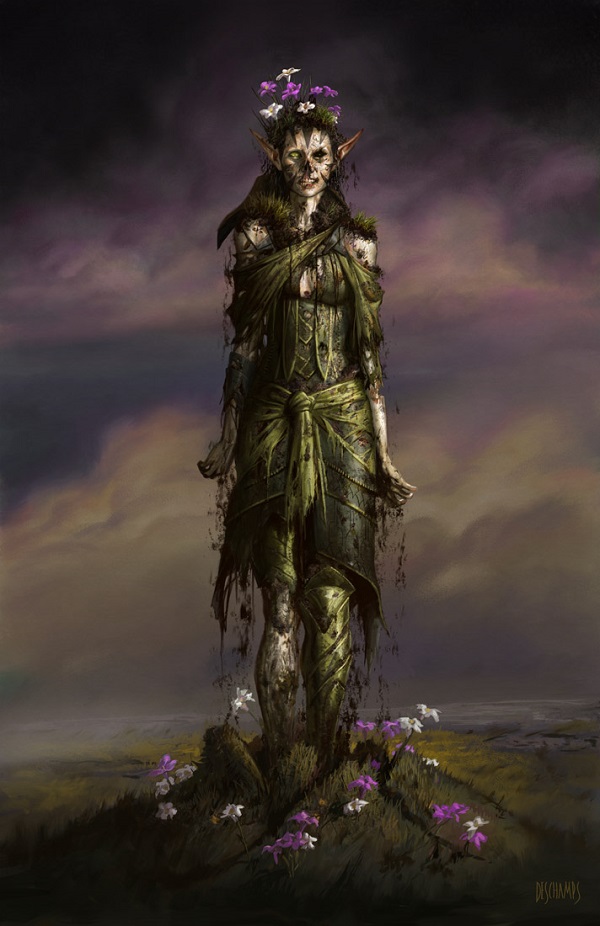 She’s a plant. Her power killed her, by burying her alive buried her alive? Maybe? Like a plant? The plant or land becomes a creature, so her? I’m confused but the stiff pose reads as plant, and Nissa is plant. The flowers are a nice touch.