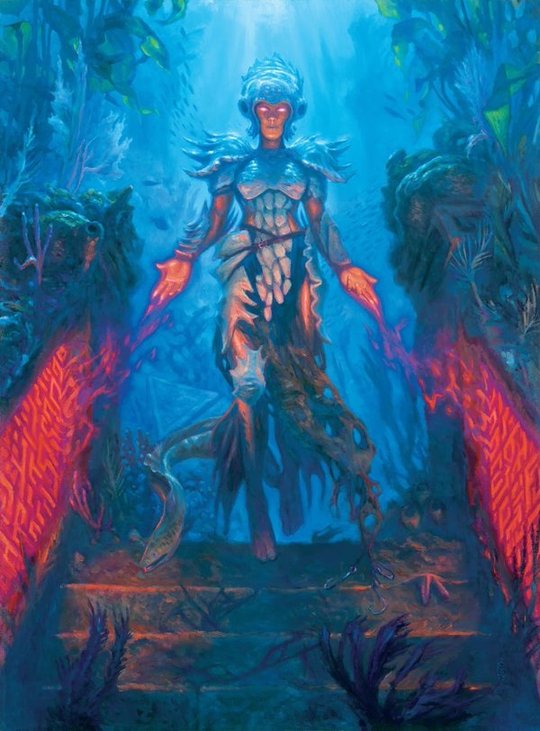 The art itself is limited in palette, using oranges highlighted with red fire akin to lava in shallow water, narrowing our field of focus, simplifying the scene. I enjoy seeing geometric shapes in artworks, like the triangle here. Sides of the triangle as hedrons overtaken by coral changes the concept of magic being encased within these hedrons. It’s a small change, and not really notable but interesting nonetheless.