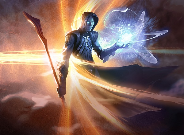 I understand what this artwork is trying to convey. A left to right orange blast is hitting the back of a Blue mage and the resulting ineffectiveness of the spell splinters away from the figure, and thus (?) creates a blue, magical energy harnessed by his hand. At card size, he has no legs, the staff isn’t needed and looks like the end of a Nimbus 2000 Quidditch broom.