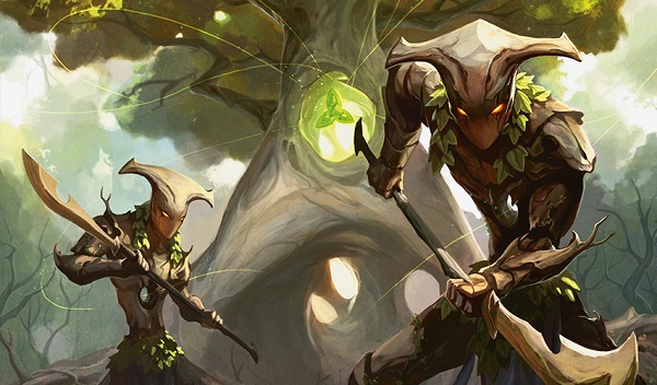 Notice the hole in the two plant warriors, echoing the tree. At card size, they could be helmets of elves. Larger, you can see the twigs off their forearms and exaggerated waistlines to minimal effect.