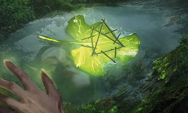 I first though the leaf and sticks were the scrying but once I see the larger art, it’s more Lecanomancy to me. Normally that means scrying with a dish of water, though here, it’s small enclosed pond. I’d like to think the leaf isn’t actually there, but rather the sticks and leaf have appeared before the elf, giving her some type of knowledge on a new mana line, thereby giving more access to mana once found or activated. That open-ended concept works great on a promo, while tying to Dominaria because, “Sylvan” is mentioned and where that is on the plane isn’t mentioned. It’s not important.