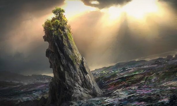 I like the Tower of Pisa lean with the strong cloud cover. It’s a good composition of an oasis atop a butte, but I can’t help but wonder that both art descriptions could’ve chosen different sketches to convey the idea better. Instead of being iconic, it looks like just another mana tower in Magic.
