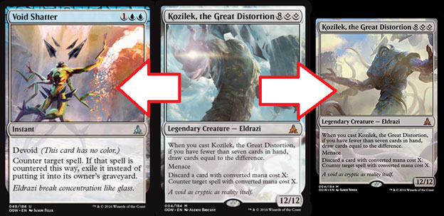 Was Alexi's art originally Void Shatter? Perhaps, but it doesn’t explain why the Jaime Jones Kozilek wasn’t used, which I would argue looks better at card size. Changing art from the original commission creates weird issues. It’s uncommon to have such major changes on prominent cards, but with moving from three sets to two, bumps occurred. You just have to look closely to see some of them.