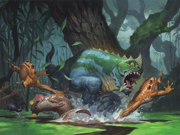 Steve’s color palette is known to be gorgeous, his usage of frog whimsy was exhibited in Lorwyn block, and finally, he gets a perfect illustration to have fun on. If you have a child, this should absolutely be an artwork for your li’l baby baloth’s room.