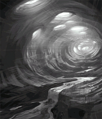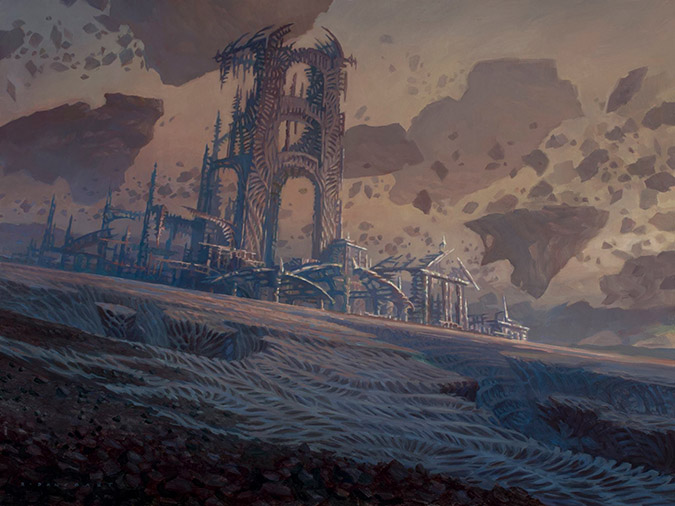Seeing Ryan Pancoast’s palette of browns, blues, and grays, he created a wasted-away structure and landscape without even needing to show hedrons or much in the way of floating buildings. He did it quietly, and I see more Dust Bowl remnant than fantastic landscape. I think that’s a good thing, but as for visually making it easy to see, this artwork struggles.