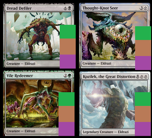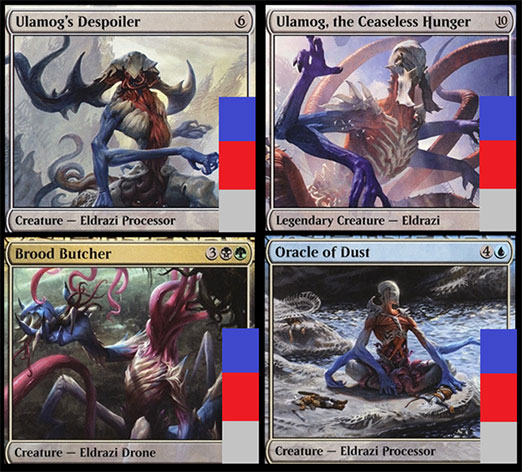 If you go back to Ulamog’s brood, there is no green. If you remember Kozilek's Sentinel being green in Battle for Zendikar, you’ll compare it to Ulamog and notice Ulamog’s blue arms more vividly. It’s making factions more visually similar. It’s just hard to see over dozens of cards by different artists.