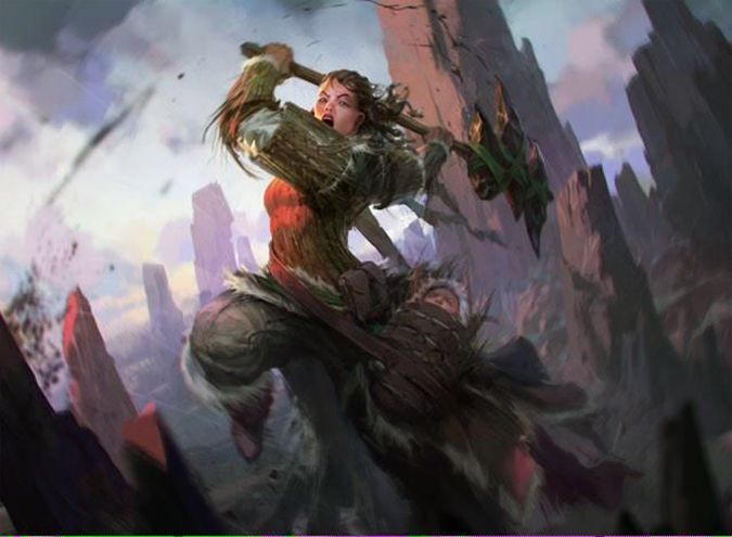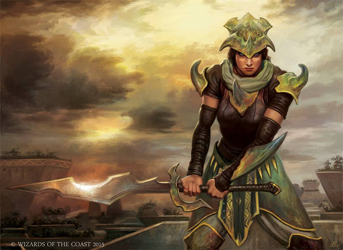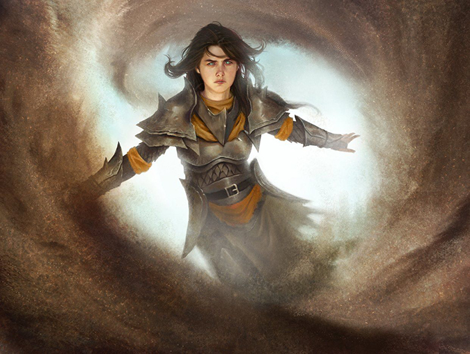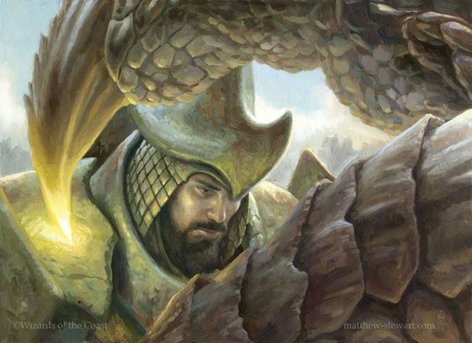 I love the women-fighters-in-reasonable-armor blog and this art exemplifies everything Magic is moving toward. Looking for sexism and less-than-stellar artworks that reinforce tired stereotypes can be found or one can “see them” that don’t exist—this I won’t deny, but in that same vein, artworks like this exist. Remove the armor, and this is a teenage girl in a dust circle, some preteen book on a magic-using woman. It doesn’t look like Magic’s past, but looks at a future today. The woman isn’t incredibly idealized—she’s thin, sure, but she isn’t Aphrodite-beautiful. That’s a good thing. It’s very Dromoka to be inclusive of everyone, and why wouldn’t their brood have someone that could be playing at your local Friday Night Magic? Why wouldn’t that be a figure there?