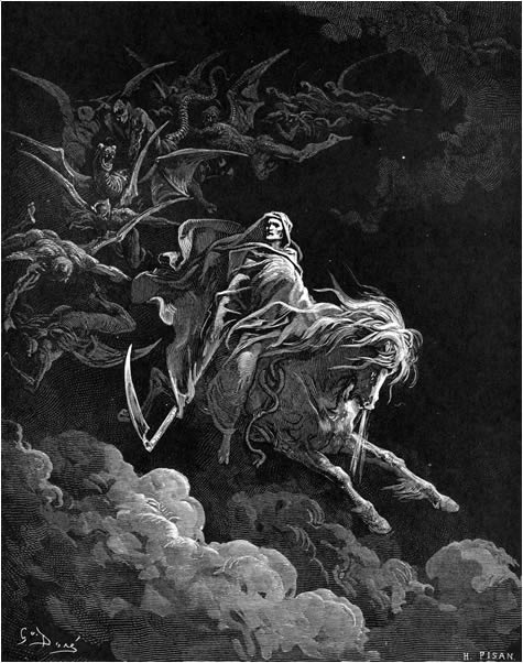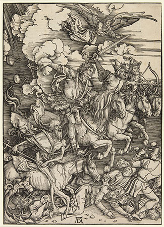 She’s being influenced to lose her mind and also to reflect a biblical story. In the Bible’s Book of Revelation 19:13, we might find an interesting allusion, stating, “And he was clothed with a vesture dipped in blood: and his name is called The Word of God.” Avacyn is a holy warrior, an embodiment of purity and also a destroyer. As such, she cannot ascertain anything other than her purpose, as it were. Taint her, and a holy avenger becomes an angel of death. Not lost on me are the four horsemen of the apocalypse, characters in this future-looking Biblical book. I recall seeing many of Albrecht Duerer’s woodcuts like The Four Horsemen of the Apocalypse shown here and seeing quiet depictions of future horrid visions. Hearing of trumpets and 1/3s of the world destroyed are hard for a reader to understand. Reading Descend upon the Sinful’s exiling of all creatures oddly makes more sense and hits home harder.