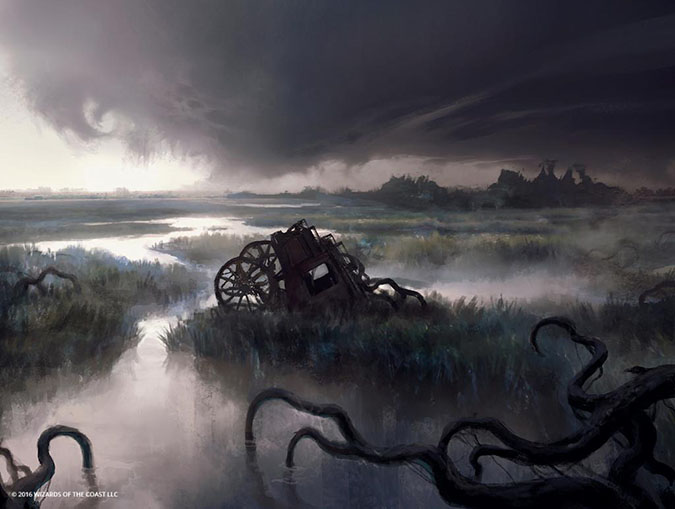 Innistrad 1.0 was preceded by the first Return to block. Scars of Mirrodin was a world forged of steel, shininess, and a war with its outcome obvious. Scars was the science-fiction block, with Innistrad being the approachable, visitable fantasy. Even notes from an art director stated that Innistrad was to be “not Phyrexia” visually:
