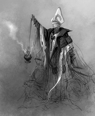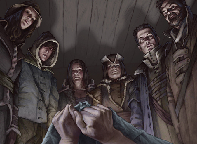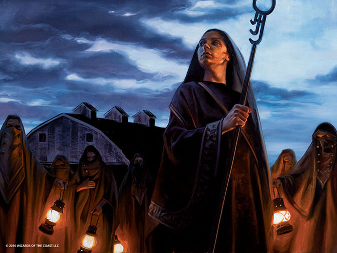 That’s not to say the humans of Innistrad weren’t a bit peculiar before, having slightly crazed eyes. They did have cannibals in their ranks, after all. True to Palumbo’s form, he builds on an apparent style guide specification of having cult members hide their faces. Their leader is shown, mutated for some reason, giving us a clue or a red herring.