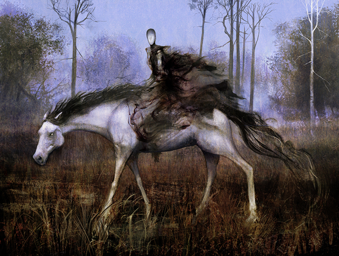 Seb painted the faceless rider as simplistic as possible, making this creature benign and accepted as a mere force in your carafe of spells instead of a destroyer of worlds.